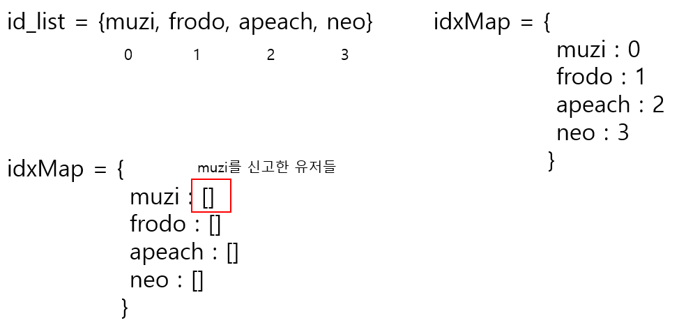 - idxMap에 맞게 끔, 신고한 Id에 대해 누적값을 1씩 증가