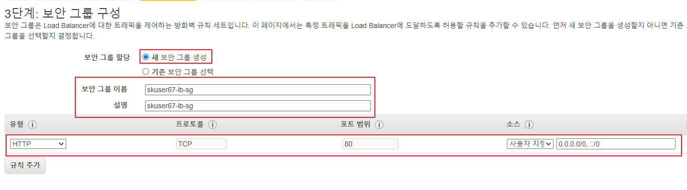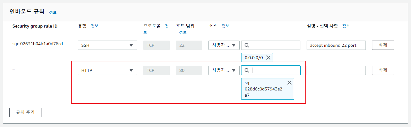 기존의 HTTP규칙의 소스항목에서 로드벨런스 생성시 만든 보안그룹을 선택후 규칙 저장
