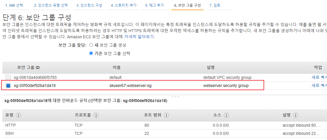 일반적으로 로드밸런스로 SSH 접속이 불필요하므로 새로운 보안그룹을 생성해서 80포트로만 접근을 허용