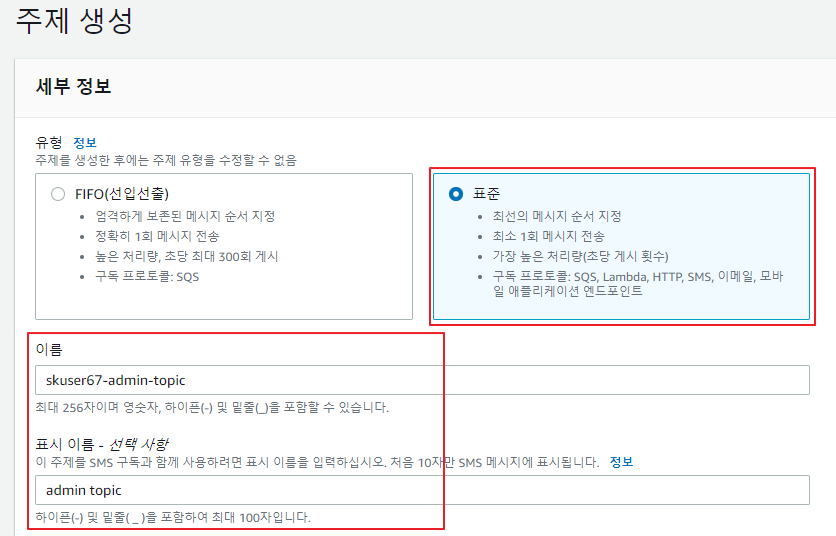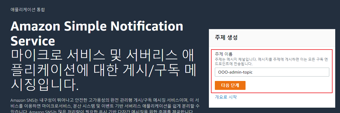 SNS 서비스 대시보드에서 주제 이름을 입력하고 다음 단계 버튼을 클릭