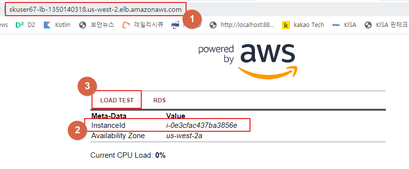 AWS 기반 웹서비스 구성 실습(2)와 마찬가지로 로드밸런스 주소로 접속하면 생성된 인스턴스로 순차적으로 라우팅되는 것을 확인할 수 있음