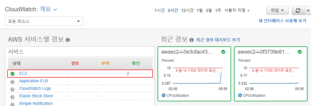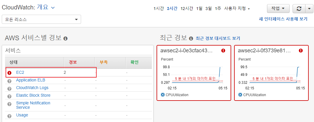 CloudWatch 서비스로 이동해서 경보 발생 여부를 확인