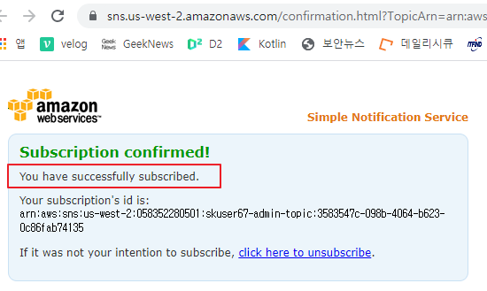본인 메일함에 구독 확정 메일 수신을 확인 후 해당 메일을 통해서 Confirm subscription 처리를 수행해야 함