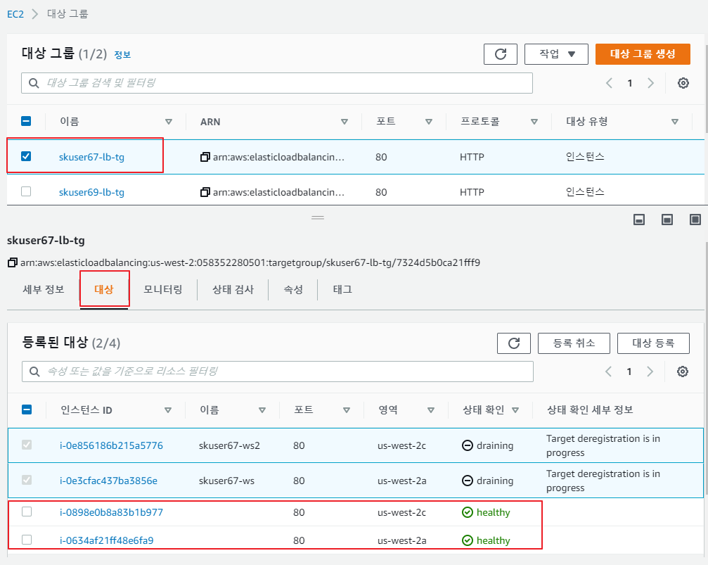 앞에서 생성한 로드밸런스에 등록된 대상 그룹의 인스턴스를 모두 등록 취소