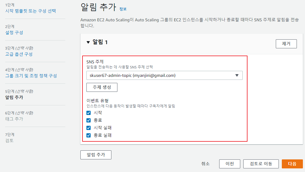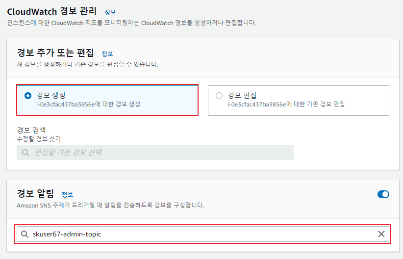 경보 생성 선택 후 본인이 생성한 SNS 토픽으로 경보가 전달될 수 있도록 선택