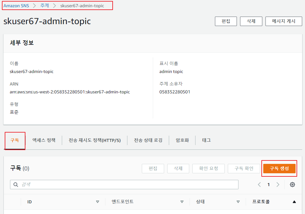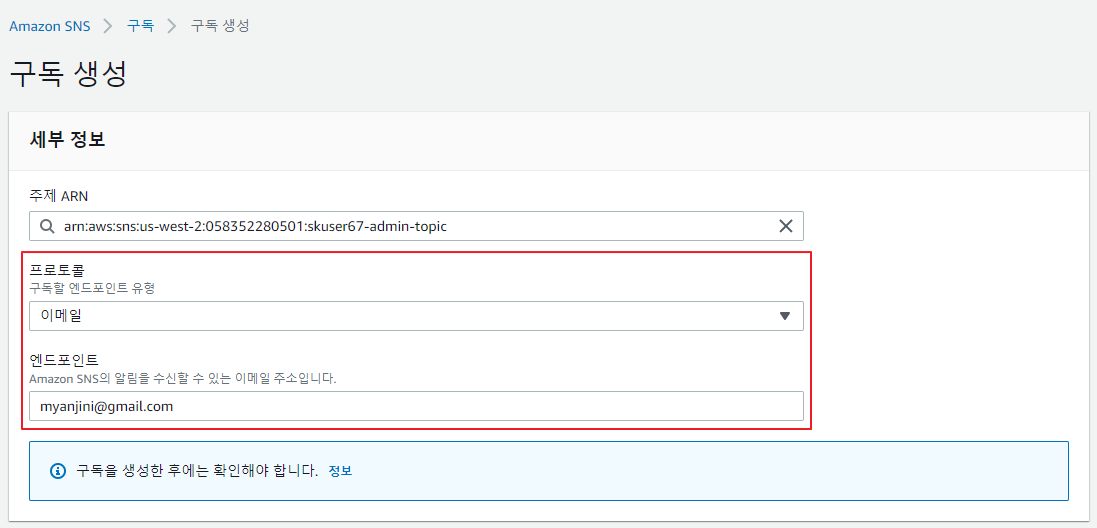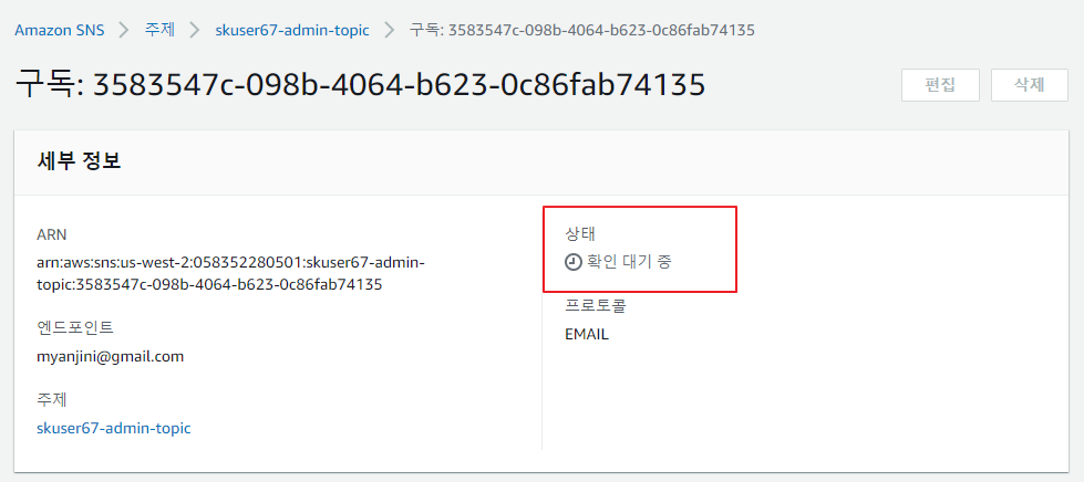 구독 생성을 확인 ⇒ 이메일 구독인 경우 이메일 확인 처리를 해야만 정상적으로 메시지를 수신할 수 있음