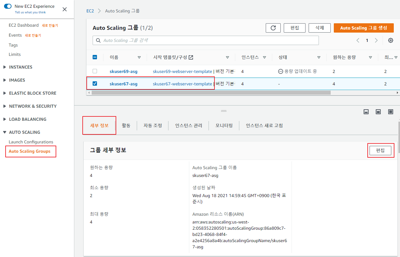 * Auto Scaling Group의 인스턴스를 종료했을 때 -> -> Auto Scaling Group에서 종료한 인스턴스가 삭제되고 최소 인스턴스 조건이 2개이므로 새로운 인스턴스를 생성(2개의 인스턴스가 동작됨)