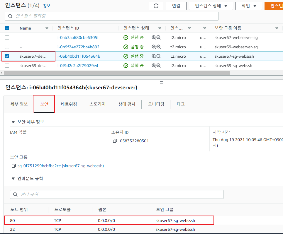 * 단 보안그룹의 경우 기존의 보안그룹이 외부에서의 80포트 접속이 거부로 설정했기 때문에 새로운 보안 그룹 생성
