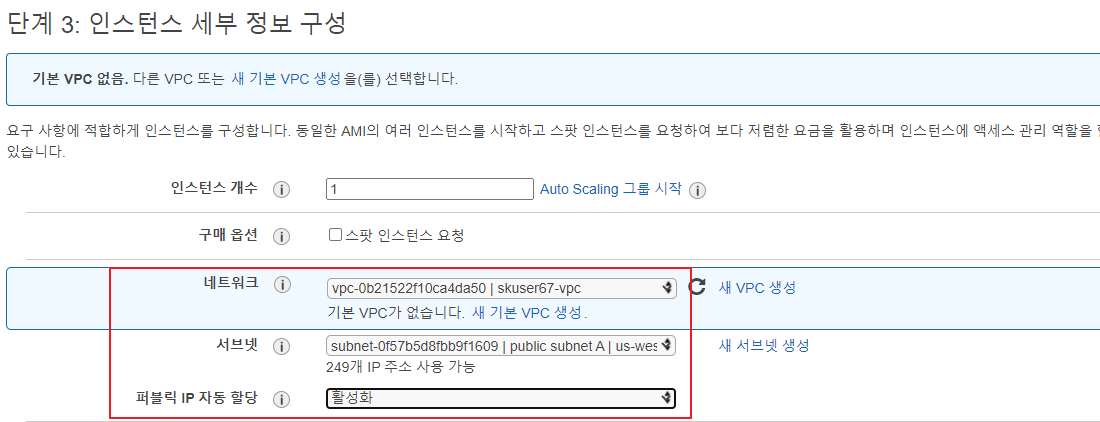 내부 설정은 AWS 기반 웹서비스 구성 실습(2, 3)에서와 동일