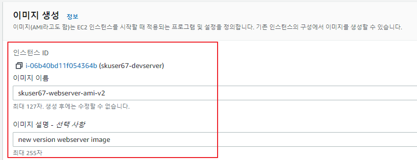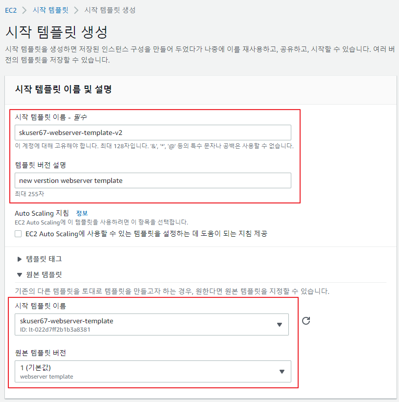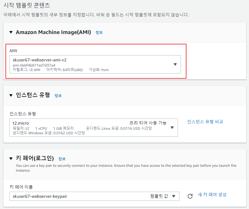 AMI 정보를 새로 생성한 AMI로 변경하고, 나머지 기존 시작 템플릿의 설정을 유지
