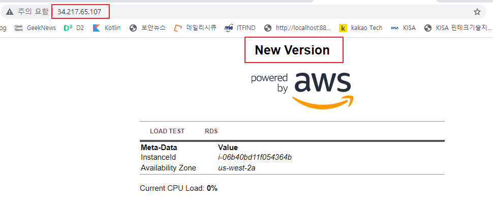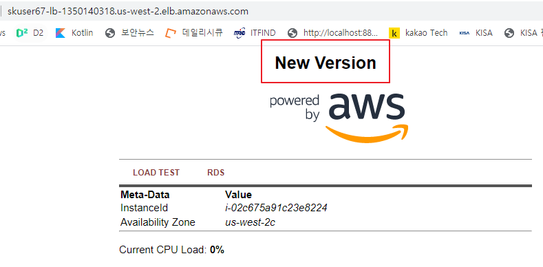 Load Balance를 통해 접속하면 이전 버전(blue)와 새로운 버전(green)이 번갈아 서비스됨